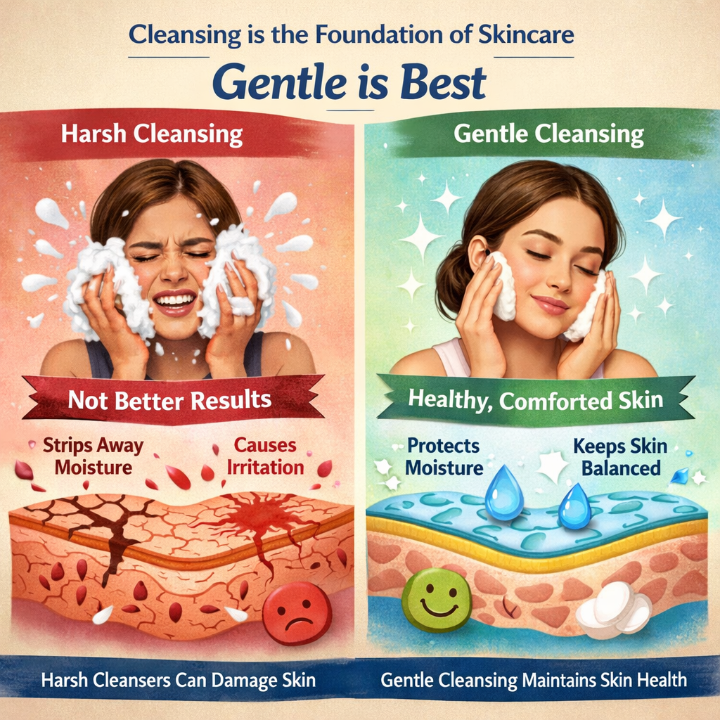 Cleansing is the foundation of any effective skincare routine, yet it is often overlooked or misunderstood. Many people assume that a strong, foaming cleanser delivers better results—but in reality, harsh cleansing can do more harm than good. Gentle cleansing is the key to maintaining healthy, comfortable skin.